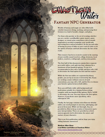INTRODUCING, the Fantasy NPC Generator (V1.1 PDF) by Chaotican Writer.